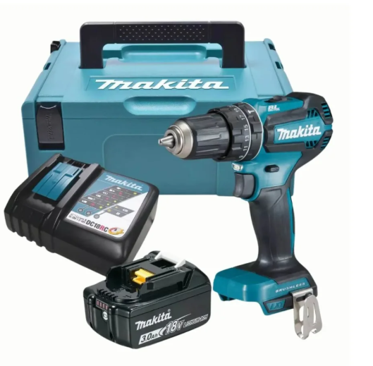 Makita DHP485RF1J – parafusadeira/furadeira de 18V com excelente desempenho em tarefas médias e pesadas, oferecendo boa autonomia e robustez.